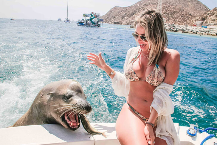 Es ist sicherlich nicht ganz einfach, einen Hund auf eine Bootsfahrt mitzunehmen. In vielen Fällen ist es besser, sie zu Hause zu lassen, um sie zu schützen. Das Meer hat jedoch eine Überraschung für uns! Unter den Meerestieren können wir einige treue Begleiter finden. Robben zum Beispiel sind bessere Schwimmer als Hunde und im Meer in ihrem natürlichen Lebensraum zu Hause. Allerdings gibt es auch hier einige Sicherheitsrisiken. Robben sind Menschen gegenüber erst freundlich, wenn sie gefüttert wurden. Ihre Lieblingsspeisen sind Fisch, Tintenfisch und Krustentiere. Die junge Frau auf dem Foto hat sie mit einigen Fischen gefüttert, um ein paar Fotos zu machen.