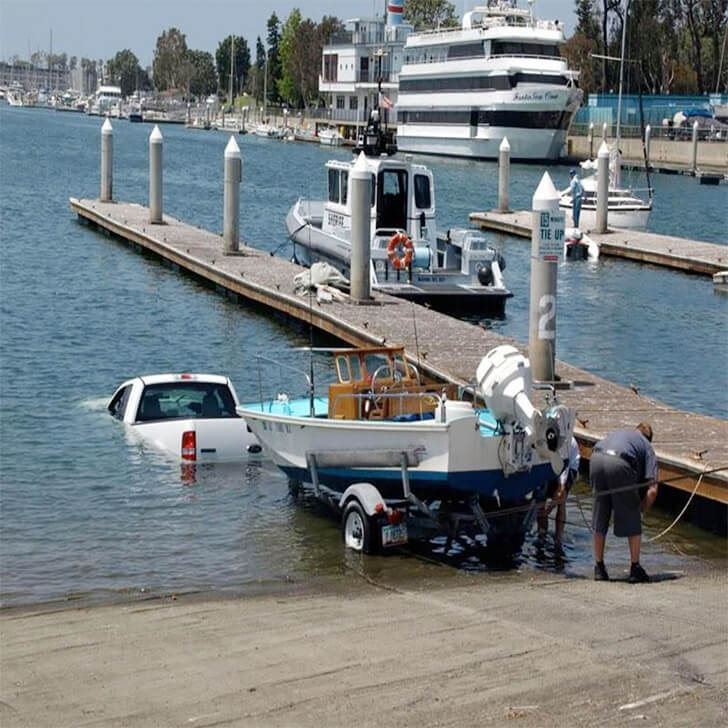 Eindeutig hatte der Besitzer in die falsche Richtung geparkt und vergessen, dass das Boot auf dem Anhänger und nicht sein Fahrzeug ins Wasser hätte getaucht werden sollen. Als er das jedoch erkannte, war es schon zu spät, und der Pick-up war unter Wasser.