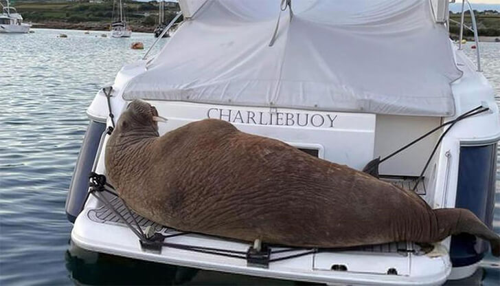 Bei diesem Walross handelt es sich um “Wally”, der bekannt dafür ist, schon an den unterschiedlichsten Orten unterwegs gewesen zu sein. Darunter in Spanien, Irland und England. Schließlich fand er eine gemütliche Liege auf einem der Boote in Cornwall. Er scheint es sich bequem gemacht zu haben und wir verstehen warum. Andere Meeresbewohner fürchten das Walross, denn er taucht regelmäßig ins Wasser, wenn er hungrig ist.